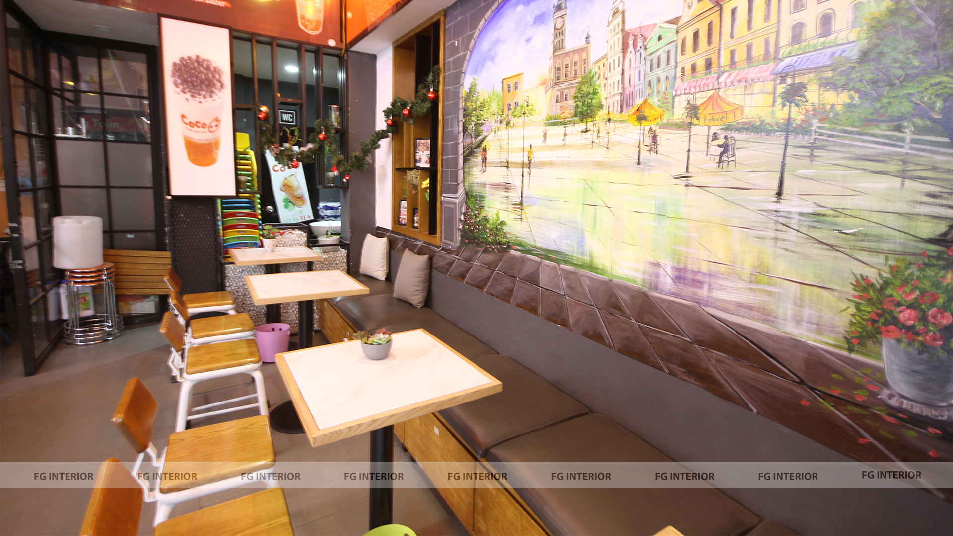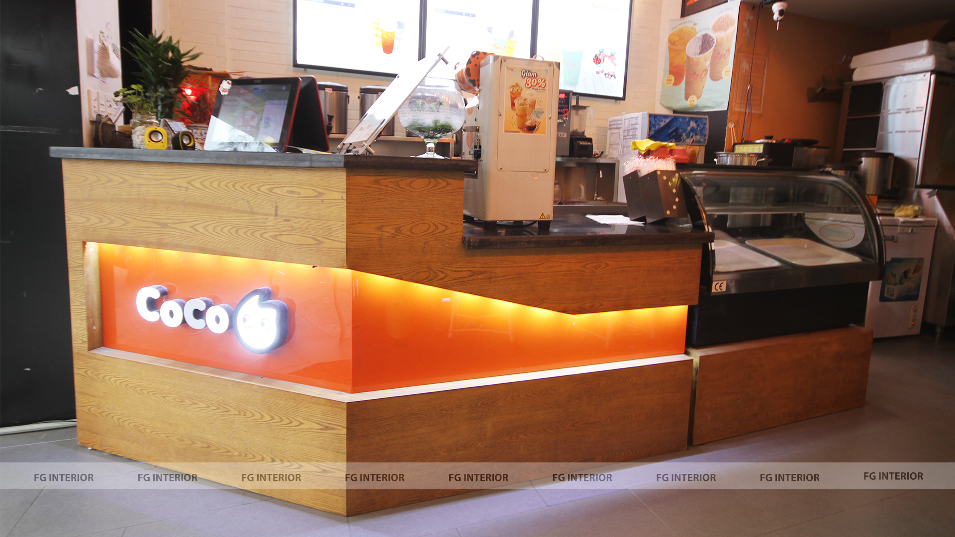 Bàn ghế quán trà sữa CoCo (cơ sở số 11, Thanh Niên, Thụy Khuê, Tây Hồ, Hà Nội) được thiết kế theo phong cách hiện đại.