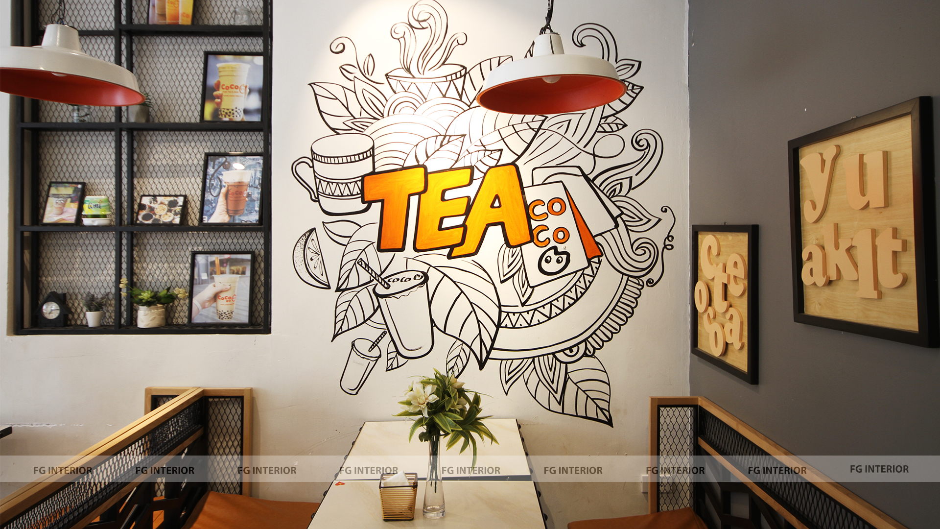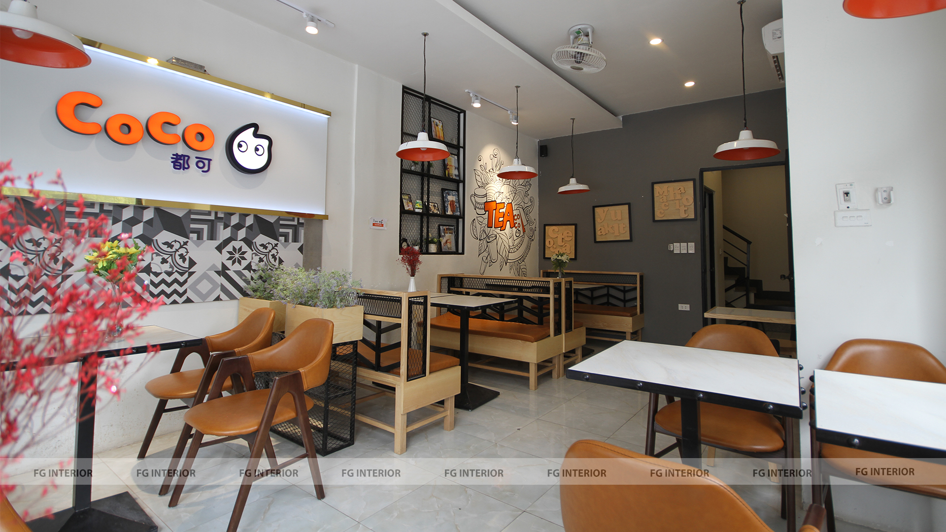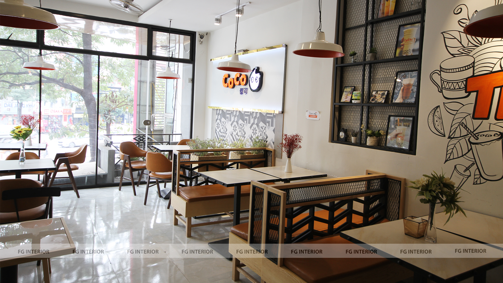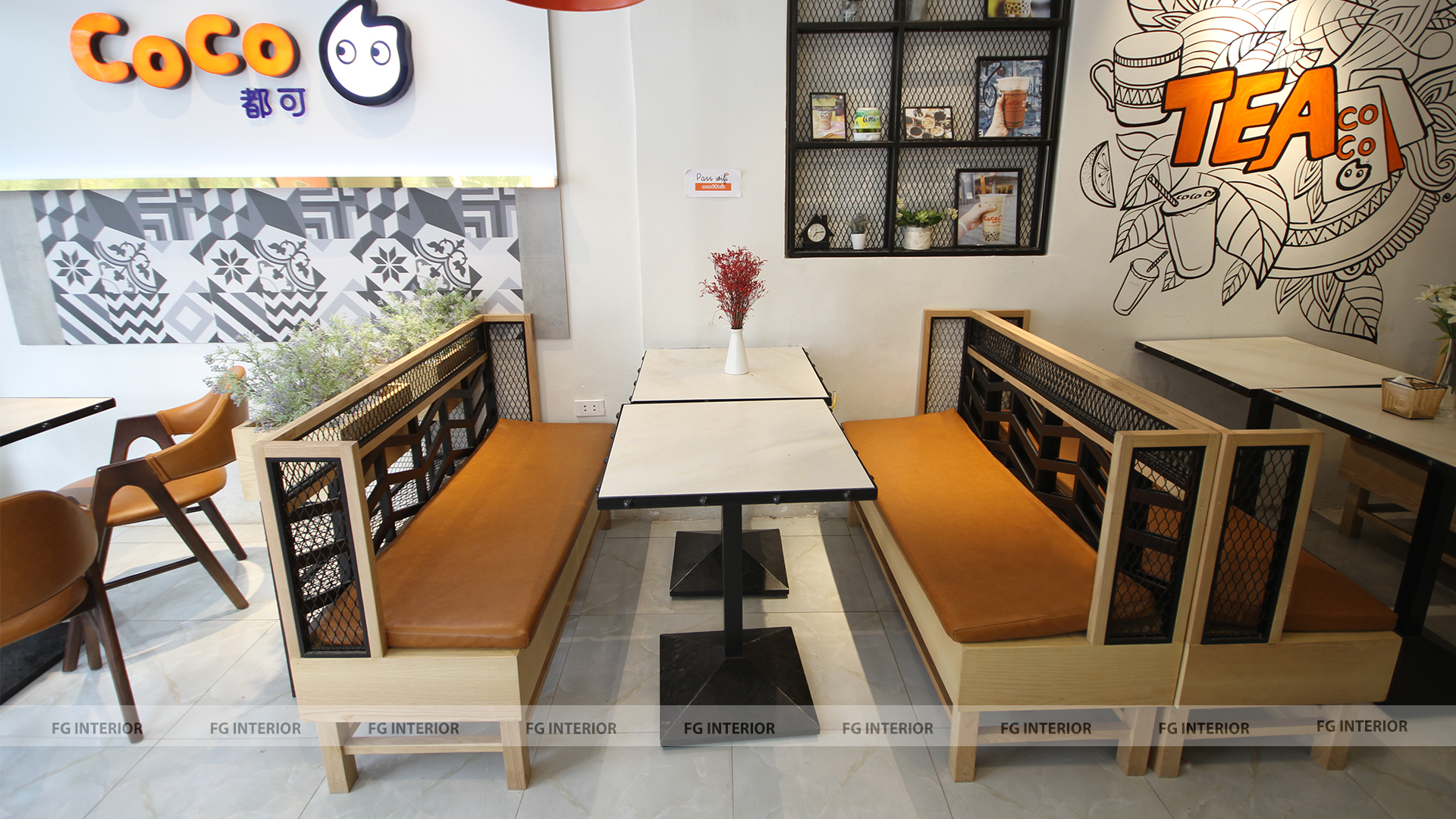 Quán trà sữa Coco số 90 Trần Duy Hưng được thiết kế theo phong cách trẻ trung, hiện đại (bao gồm ghế gỗ đệm, ghế sofa gỗ đệm, bàn gỗ chân sắt sơn tĩnh điện)