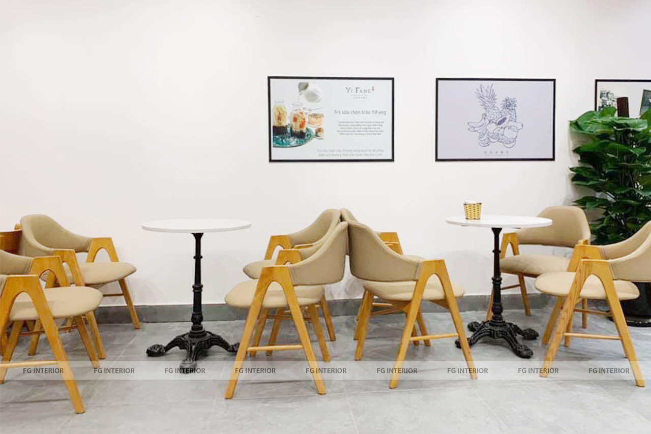 Bạn có thể dễ dàng nhận diện được thương hiệu trà sữa hoa quả đến từ Đài Loan này qua màu sắc, thiết kế đặc trưng của cửa hàng. Trung thành với thiết kế mẫu, Yi Fang lựa chọn một vài mẫu bàn ghế, quầy cho không gian trà của mình. Mẫu ghế được ưu ái là mẫu ghế Compass, ghế Starbucks, ghế đôn, bàn tròn chân sắt...