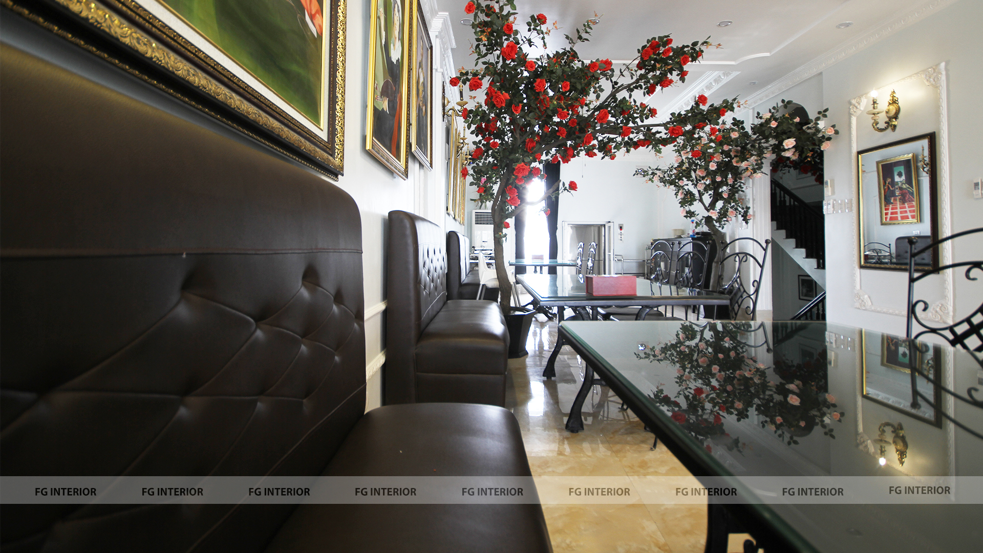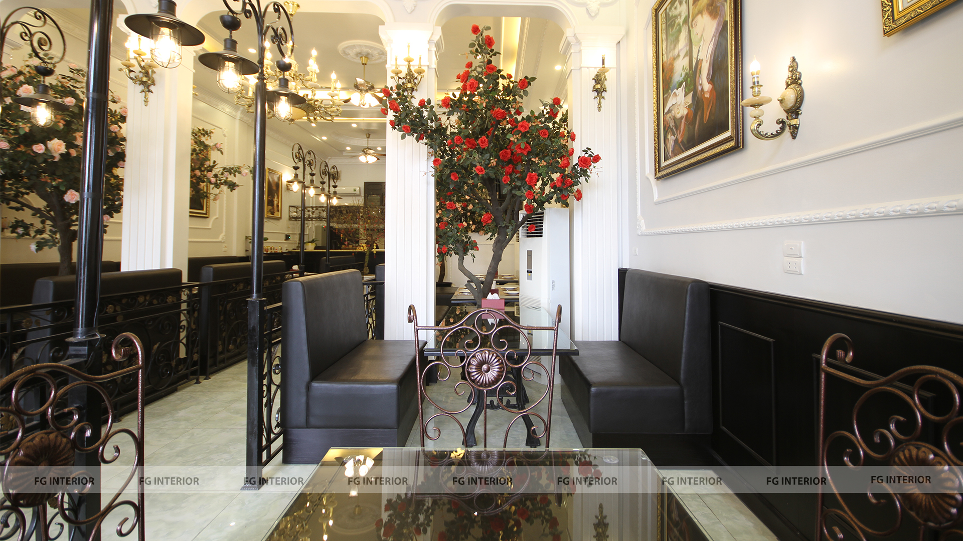 Đáp ứng theo mong muốn của chủ nhà hàng là tạo ra 3 dãy bàn ghế mà vẫn có thể thiết kế lối đi vào rộng rãi ở chính giữa vì thế kiến trúc sư đã lên ý tưởng thiết kế ghế sofa đệm liền tường và bàn ghế chân sắt linh động. Ngoài bàn ghế, chúng tôi còn thi công hệ thống đèn chiếu sáng trong nhà hàng. Đây là mẫu dự án nhà hàng phong cách Pháp mà chúng tôi muốn giới thiệu tới các chủ nhà hàng trong tương lai. Quý khách có nhu cầu thiết kế nội thất bàn ghế nhà hàng, quán cafe, trà sữa, khách sạn,... hãy liên hệ với FG để được tư vấn.