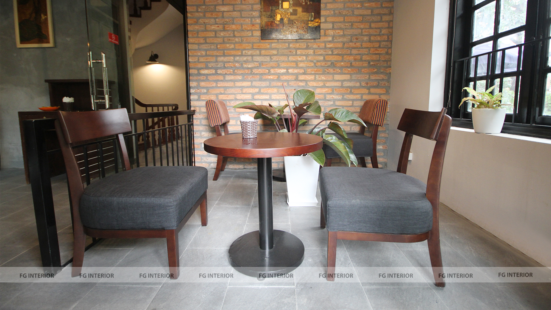 Những chiếc ghế gỗ trẻ trung, hiện đại cùng với bàn gỗ chân sắt sơn màu đen hài hòa với màu sơn tường được lựa chọn để đặt ở hiên quán mở ra một không gian tươi tắn, tràn đầy sức sống.