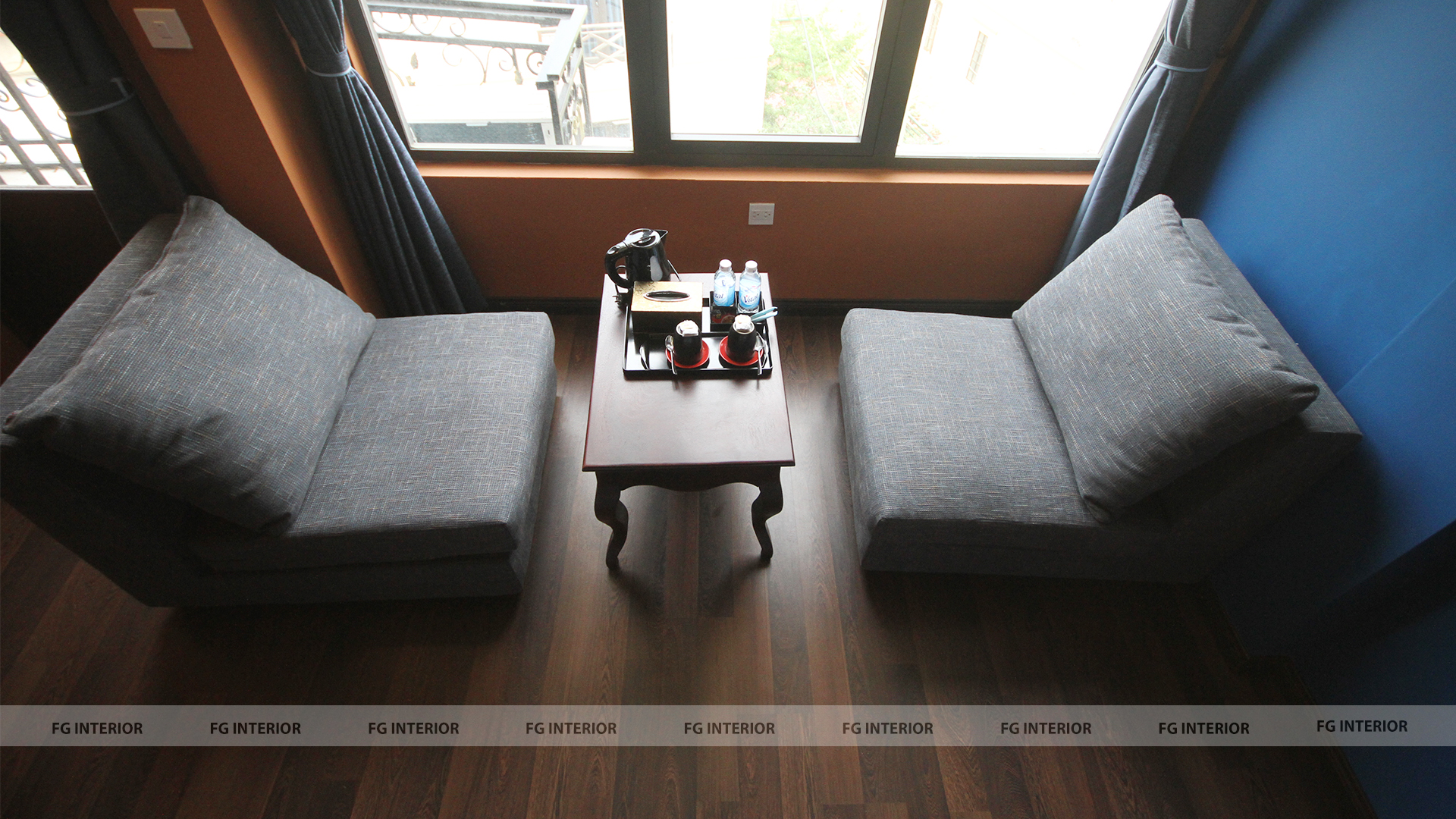 Bên cửa sổ có bộ bàn ghế sofa gỗ đệm rộng rãi, bọc đệm nỉ êm ái màu xanh dương nhẹ nhàng là chỗ ngồi thư giãn tuyệt vời cho du khách mỗi buổi sáng hoặc tối khi trở về khách sạn.